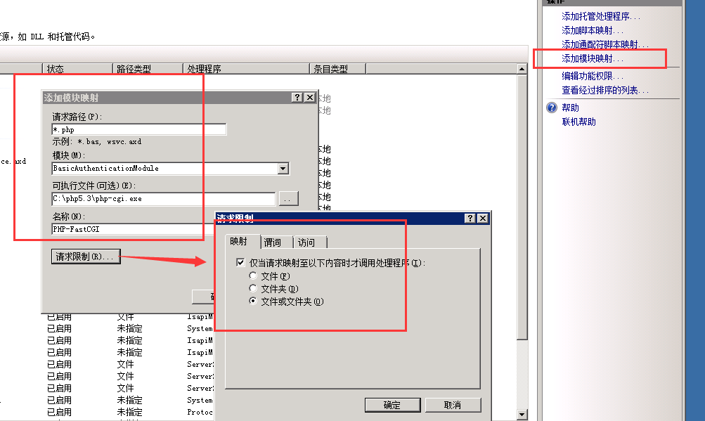 按照php的官网,还需要在这个窗口中,点击“请求限制”按钮,在弹出的“请求限制”窗口中,勾选“仅当请求映射至以下内容时才调用处理程序”,然后下面单选按钮选择“文件或文件夹”。